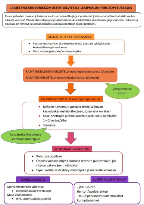 Perusopetuslain mukaan jokaisessa koulussa on laadittu järjestyssäännöt, joiden noudattamista kaikki koulun aikuiset valvovat. Rikkeestä keskustellaan aina aikuisen kanssa. Mikäli rike on vakava tai se toistuu, järjestetään oppilaalle kasvatuskeskustelu. Sen pitää opettaja, joka on nimetty koulun kasvatuskeskustelijaksi (kake-opettaja).