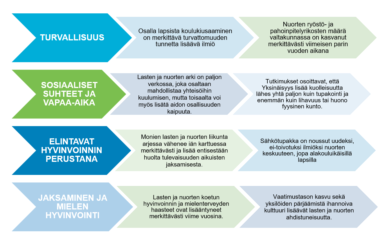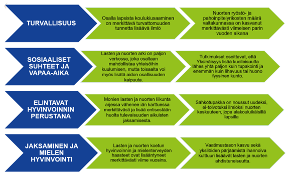 Hyvinvoinnin osa-alueiden joukosta on tunnistettu tähän aikaan ja hetkeen vahvasti resonoivat ilmiöt ja asiat, joilla on vaikutusta lasten ja nuorten hyvinvoinnille niin Lempäälässä kuin valtakunnallisestikin. Tunnistetut ilmiöt, isot kokonaisuudet, ovat: