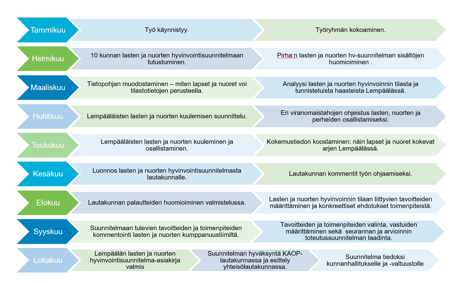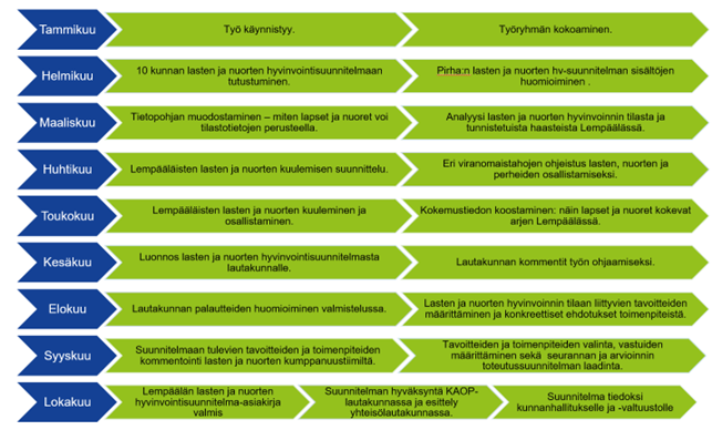 Lasten ja nuorten hyvinvointisuunnitelman laadintaan on osallistettu monialainen työryhmä, johon kuului edustajia kunnan varhaiskasvatuksesta, opetustoimesta sekä nuorisotyöstä. Alla on kuvattu hyvinvointisuunnitelman syntyprosessi:
