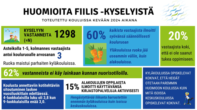 - Ala- ja yläkoulujen oppilaille toteutettiin koulufiiliskysely, jolla kartoitettiin kokemuksia arjesta, koulusta ja opetuksesta sekä ajatuksia tulevaisuudesta ja niihin liittyvistä odotuksista. Kyselyyn vastasi 1298 oppilasta.
