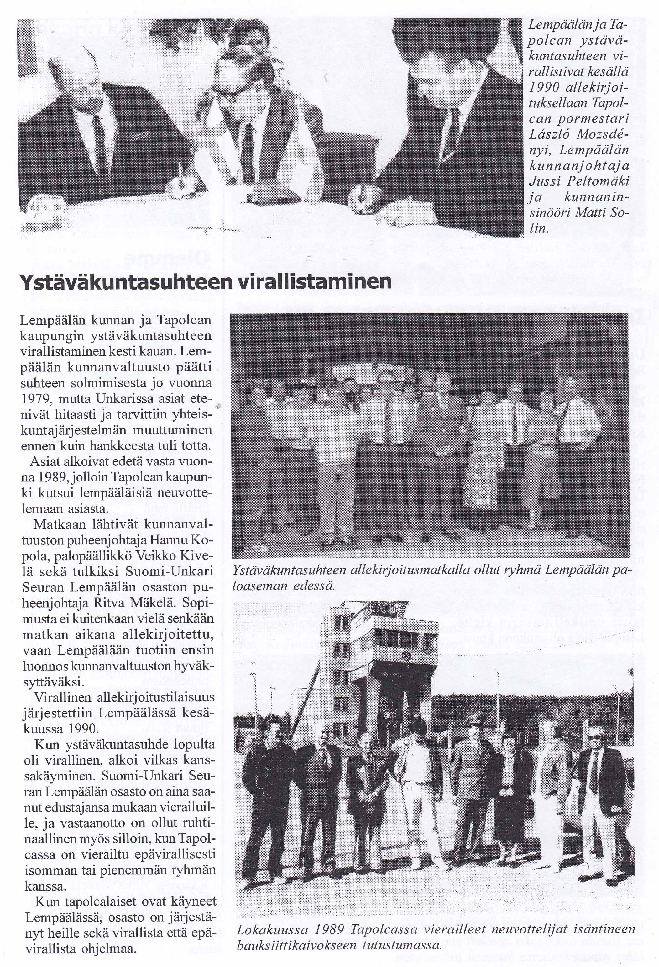 Ystävyyskuntasopimusta edelsi aiempi yhteistyö, sillä vuonna 1978 Lempäälän puolivakinaisen palokunnan ja Tapolcan kaupungin palokunnan välille solmittiin ystävyyssuhde. Lempäälän kunnasta kävi 15 palotoimen edustajaa Tapolcassa lokakuussa 1978 ja vastaavasti Tapolcasta kävi vastaavia edustajia Lempäälässä kesäkuussa 1979. Lempäälässä toimii Suomi-Unkari-seuran paikallisyhdistys, lisätietoa täältä.
