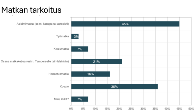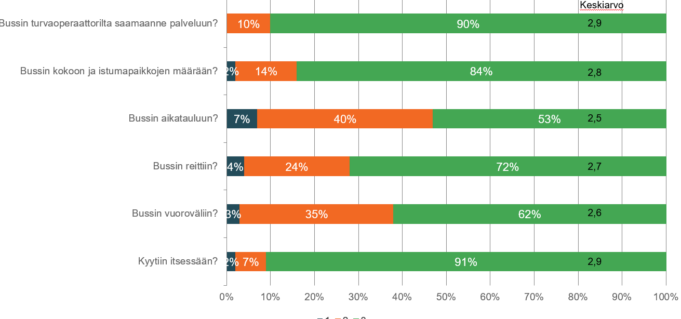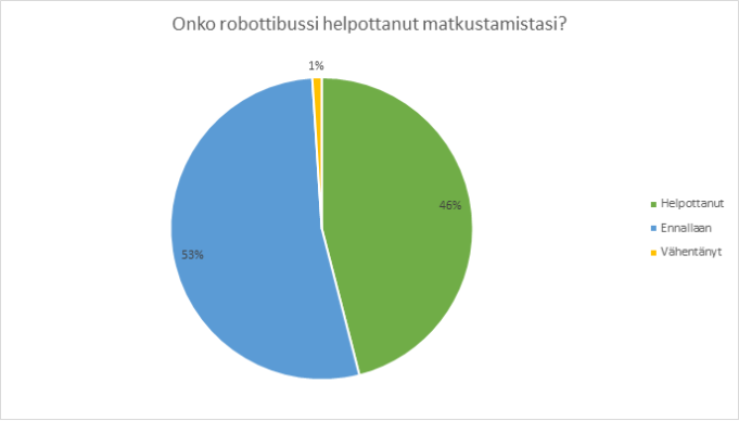 Hieman yli kolmannes matkustajista pystyi hyödyntämään robottibussia edestakaisilla matkoilla. Robottibussi helpotti liki puolta kyselyyn vastanneita matkustajia. Moni toivoikin pilotin jatkumista ja laajentamista ympäri kuntaa erilaisilla reiteillä.