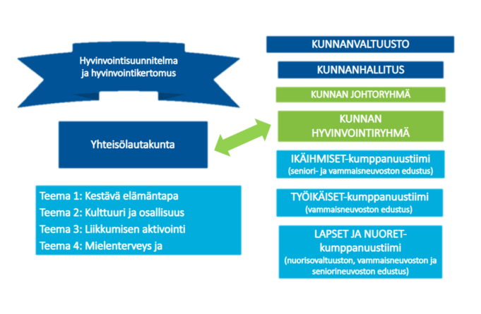 Kunnan hyvinvointityöryhmä toimii kunnassa poikkihallinnollisesti hyvinvoinnin ja terveyden edistämisen toimeenpanevana yhteistyöryhmänä (Laki sosiaali- ja terveydenhuollon järjestämisestä §6), jonka tehtävinä ovat: