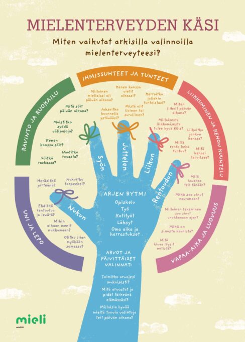 Mielen hyvinvointia ei voi erottaa kokonaishyvinvoinnista. Kun elämässä on kaikki hyvin, arki tuntuu sujuvalta. Tavallinen päivärytmi, fyysisistä perustarpeista huolehtiminen, mielekäs tekeminen ja ihmissuhteet ovat mielen hyvinvoinnin kulmakiviä. Alta löytyy tekemistä ja ryhmätoimintaa mielen hyvinvoinnin ylläpitämiseksi ja edistämiseksi.